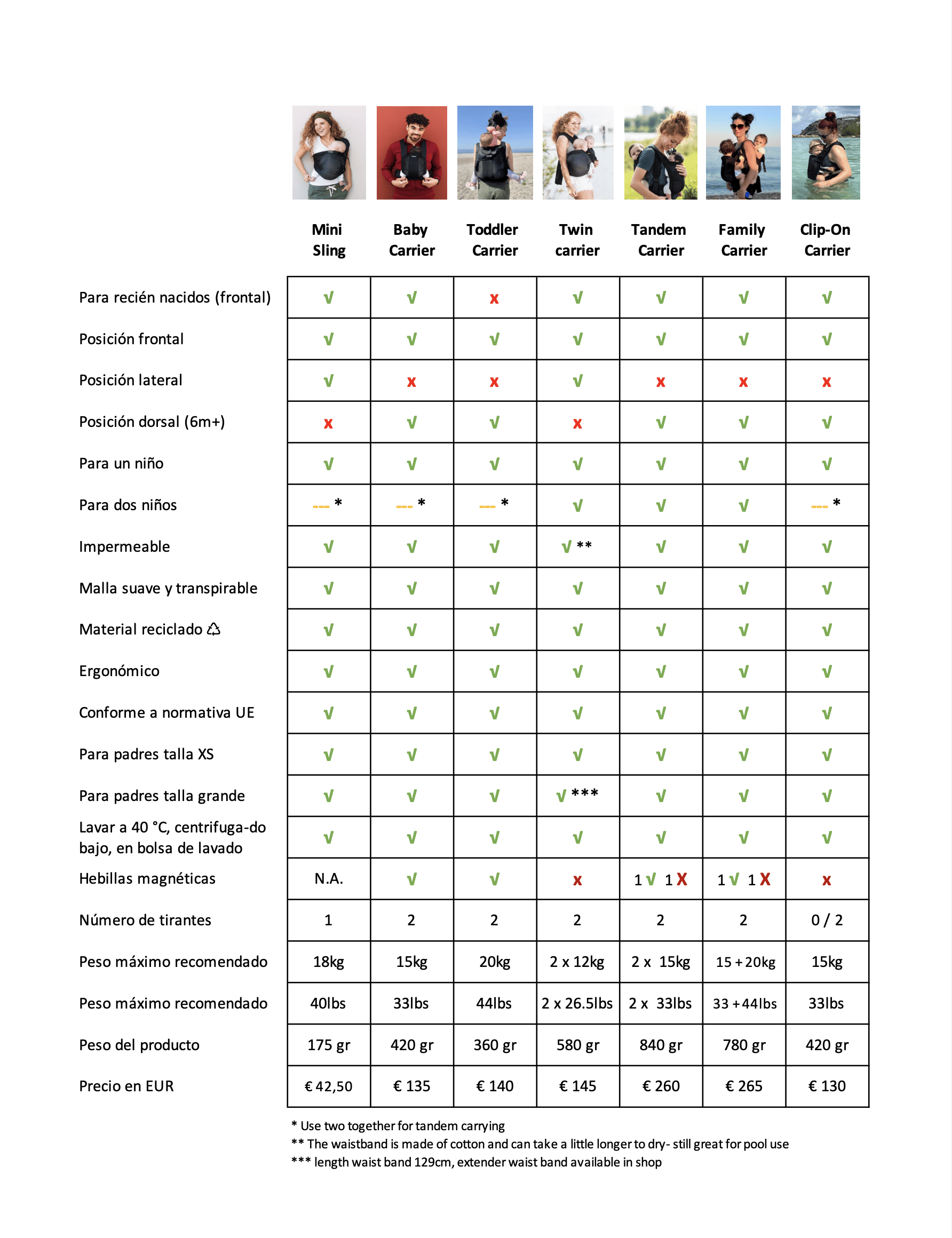 Cada familia es diferente, y nuestros portabebés también lo son. Por eso hemos creado esta tabla: para ofrecerte una visión clara y sencilla de las ventajas y desventajas de cada modelo. Con esta comparación rápida, podrás ver fácilmente qué portabebés Minimonkey se adapta mejor a ti y a tu pequeño.
